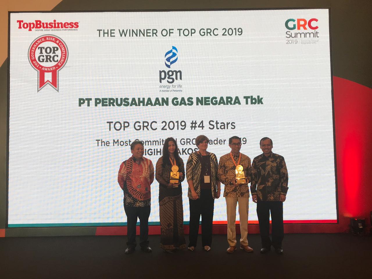 JAKARTA - PT Perusahaan Gas Negara Tbk. (PGN) berhasil meraih penghargaan sebagai TOP GRC 2019 #4Stars dan Direktur Utama PGN Gigih Prakoso Soewarto dinobatkan sebagai The Most Committed GRC Leaders 2019 di ajang Top Governance Risk & Compliance Summit 2019 yang digelar  di Hotel Borobudur, Jakarta (22/08/2019).