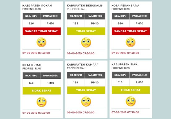 Sementara di Bengkalis, Dumai, Siak, Kampar masuk kategori 'Tidak Sehat' dengan ISPU beravariatif. Di Bengkalis, nilai ISPU mencapai 185, Dumai 138, Kampar 199 dan Siak 118.