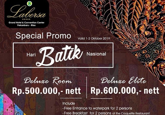 PEKANBARU - Dalam rangka memeriahkan Hari Batik Nasional tanggal 2 Oktober, Labersa Grand Hotel & Convention Center memberikan promo yang sangat sayang dilewatkan.