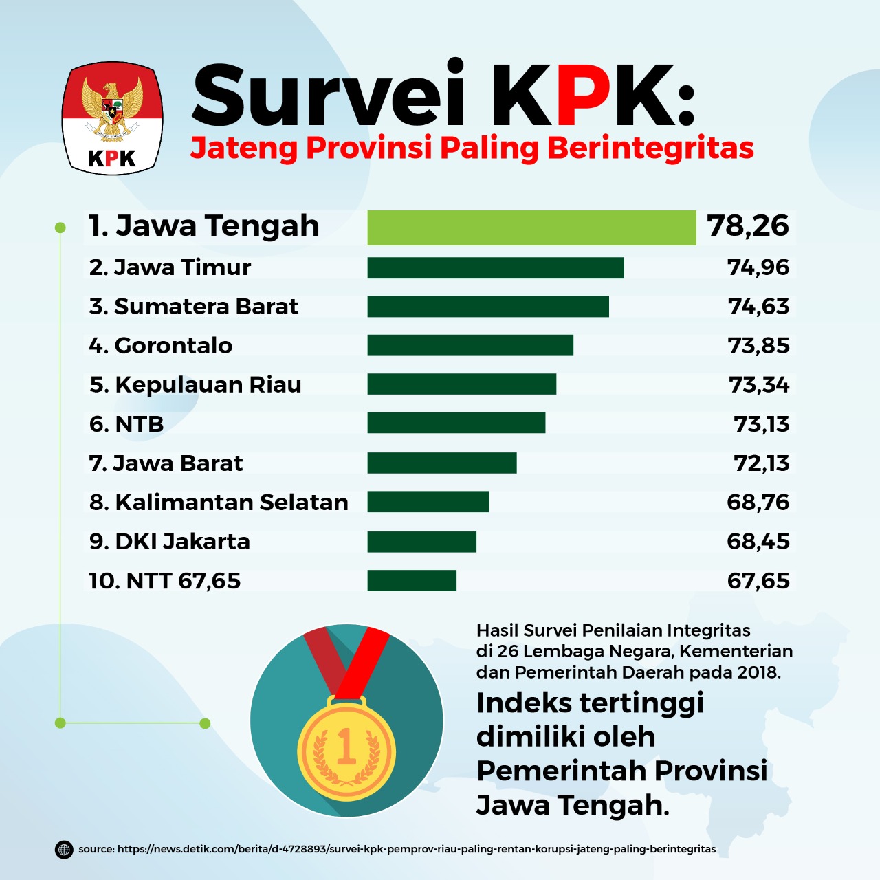 "Indeks tertinggi dimiliki oleh Pemerintah Provinsi Jawa Tengah. Indeks terendah dimiliki oleh Pemerintah Provinsi Riau," kata Direktur Penelitian dan Pengembangan KPK Wawan Wardiana di Gedung KPK, Jalan Kuningan Persada, Jakarta Selatan, Selasa (1/10/2019).