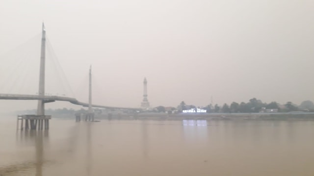JAMBI - Kabut asap pekat menyelimuti Kota Jambi, Jambi, pagi ini. Pemkot Jambi menyatakan udara pagi ini dalam kategori berbahaya.