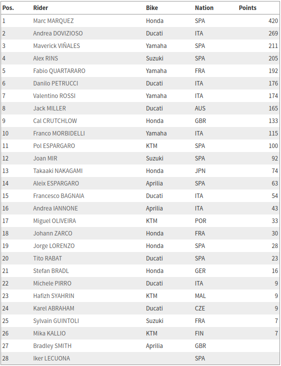 Juara dunia sembilan kali, Valentino Rossi, duduk di peringkat ketujuh dengan 174 poin. Sementara Jorge Lorenzo, yang memutuskan pensiun di akhir musim, harus puas menutup kariernya di peringkat ke-19 klasemen dengan 28 poin.*