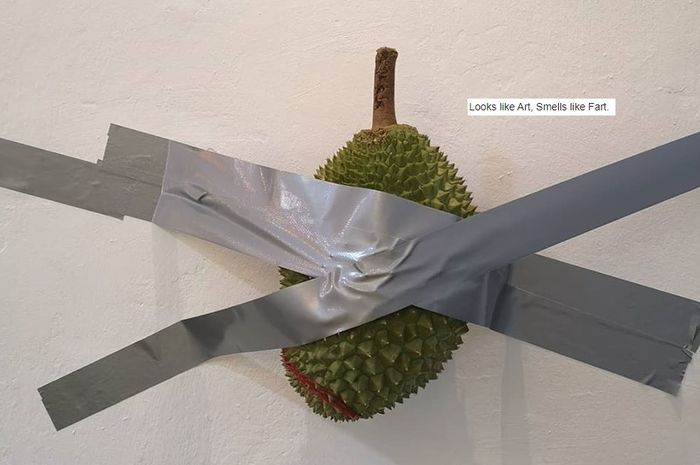 “Durian tape to white wall SGD163.056 (setara Rp1,6 miliar). Terlihat seperti seni dan baunya seperti kentut. Seni perbudakan durian sebagai pengingat perjuangan masa lalu nenek moyang kami. Selotip itu menandakan penindasan dari masa kolonial,” tulisnya.