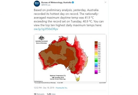 Biro Meteorologi Australia melalui unggahan di Twitter, (19/12/2019), memperlihatkan peta tingkat suhu panas yang terjadi di Australia.