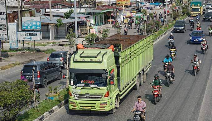 Jika truk dari arah lintas barat menuju lintas utara, truk bisa melalui Jalan Garuda Sakti-Jalan Air Hitam menuju tugu menabung di Jalan Riau Ujung.
