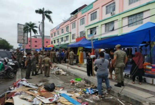 PEKANBARU - Satpol PP Kota Pekanbaru menertibkan pedagang kaki lima (PKL) di eks Tempat Penampungan Sementara (TPS) area Sukaramai Trade Centre (STC) Jalan Jendral Sudirman, Jumat (6/3/2020).