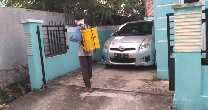Penyemprotan menggunakan disinfektan yang dibuat secara mandiri ini menggunakan anggaran RT. Seluruh bangunan di perumahan yang berada tepat didepan Kampus Universitas Islam Negeri (UIN) Suska ini disemprot oleh warga.
