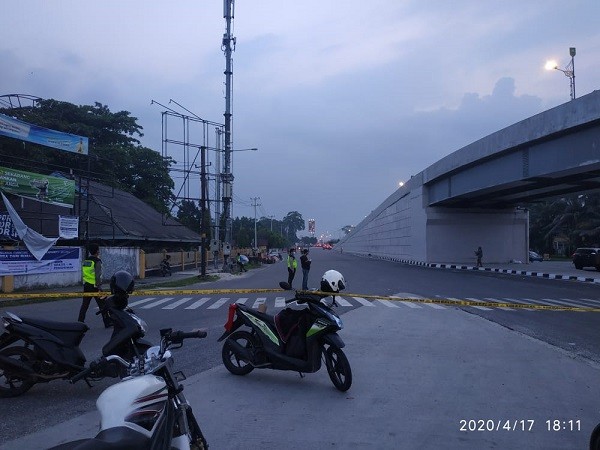 PEKANBARU - Sebagai upaya pengawasan Pembatasan Sosial Berskala Besar (PSBB) di Kota Pekanbaru, Jumat (17/4/2020) Polresta Pekanbaru menutup beberapa akses jalan protokol demi mengurangi keramaian di jalan raya.
