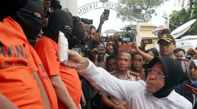"Kalau kena adekmu bagaimana? Mau kalau kena anakmu? He... jawaben... mau adekmu tak kasih ini," kata Risma sembari menyodorkan pil double L ke muka para tersangka.