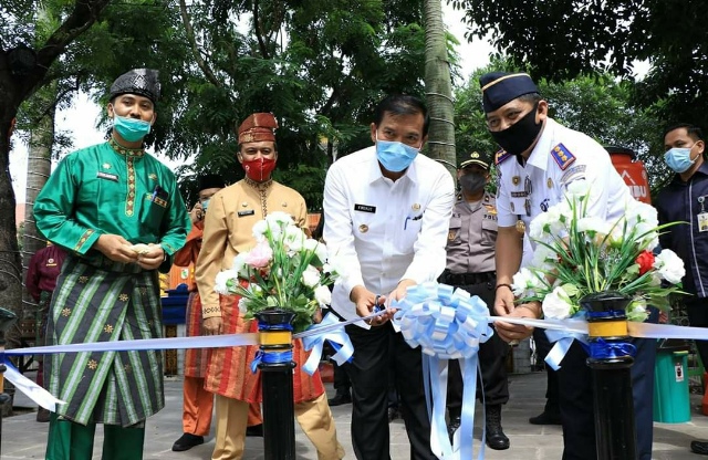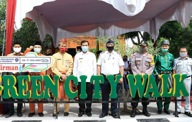 PEKANBARU - Wali Kota Pekanbaru, Firdaus meresmikan langsung pemanfaatan pedestrian Sudirman Green City Walk, yang berada di sepanjang Jalan Jendral Sudirman, Senin (22/6/2020) kemarin. Disaat yang bersamaan juga dilakukan launching 2 koridor baru bus Trans Metro Pekanbaru (TMP), dan pemanfaatan pelican crossing.