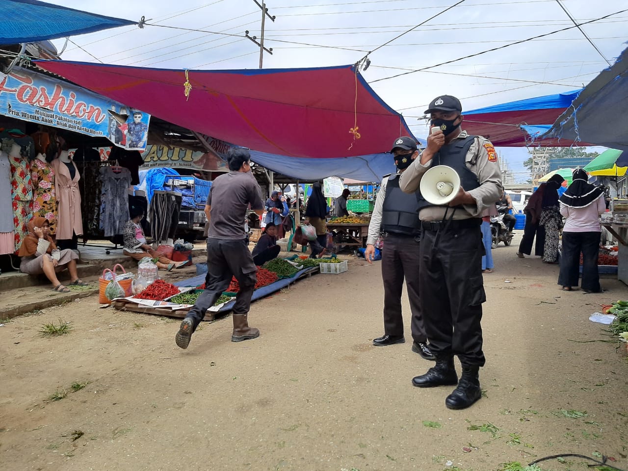 "Bapak/Ibu kami dari polsek ukui, menghimbau bahwa covid19 itu masih ada, untuk itu ayo kita disiplinkan protokol kesehatan, yang pertama selalu kenakan masker, cuci tangan pakai sabun, jaga jarak, tidak usah berlama-lama di pasar, segera kembali kerumah dan mandi jika sudah selesai berbelanja" ujar salah satu personil polsek menyampaikan melalui toa pengeras suara*