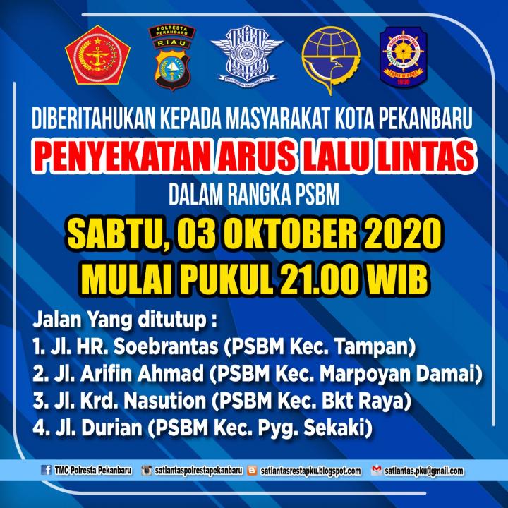 "Kami beritahukan dan informasikan bahwa pada hari Sabtu tanggal 3 Oktober 2020 pukul 21:00 WIB akan dilaksanakan penyekatan atau pengalihan arus lalu lintas dalam rangka PSBM di Kecamatan Bukit Raya, Marpoyan Damai dan Payung Sekaki, serta PSBM tahap II Kecamatan Tampan," jelas Emil, Jumat (2/10/2020).