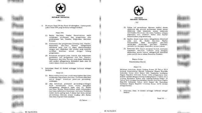 Ketiga, ada pasal 175 yang mengubah pasal 53 ayat (5) Undang-Undang Nomor 30 Tahun 2014 tentang Administrasi Pemerintahan.