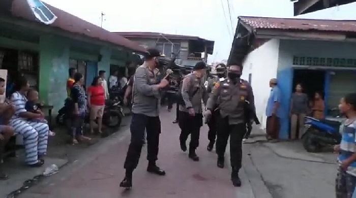 Personil polisi terlihat membawa peralatan keamanan karena saat ingin melakukan penangkapan mendapat perlawanan dari kelompok yang diduga bagian dari bandar tersebut.