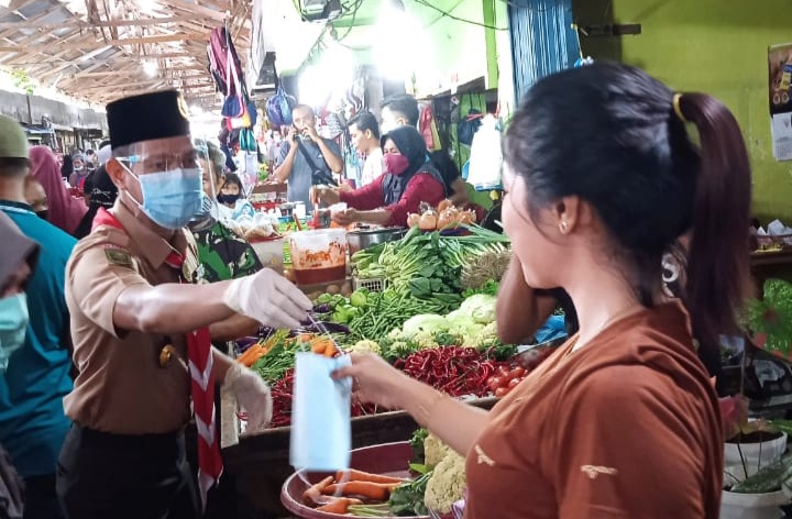 "Pakai maskernya ya buk," ujar Ketua Kwartir Cabang Gerakan Pramuka Kota Kota Pekanbaru, Masykur Tarmizi sembari membagikan masker kepada pedagang di Pasar Dupa, Kecamatan Marpoyan Damai, Ahad (29/11/2020) pagi.