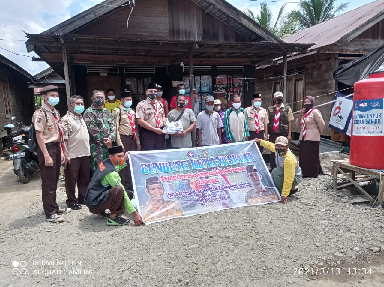 BANJARMASIN - Kwartir Cabang Gerakan Pramuka Kota Pekanbaru, yang dipimpin Ketua Harian Toni Werdiansyah menyerahkan bantuan bumbung kemanusiaan pada sabtu (13/3) ke Desa Waki Baru, Kec. Batu Benawa Berabai, Kabupaten Hulu Sungai Tengah, Kalsel. Rombongan Pramuka Pekanbaru yang terdiri dari Sekretaris Deny Rendra, Ketua DKC Rizki Eldi dan Sekretaris Satgas Pramuka Peduli Kwarda Riau Ajis Putra didampingi oleh pengurus Kwarda Kalimantan Selatan, Andalan Fathan, Ketua Satgas Pramuka Peduli Gazali dan pengurus lainnya.