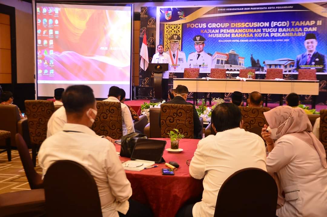 PEKANBARU - Wali Kota Pekanbaru DR. H. Firdaus ST. MT Menghadiri Focus Group Discusion (FGD) Tahap II Kajian Pembangunan Tugu Bahasa dan Moseum Bahasa Kota Pekanbaru bertempat di Hotel Jatra Kota Pekanbaru, Rabu, (14/04/2021).