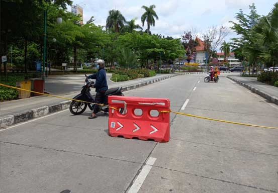 PEKANBARU - Kendaraan tidak bisa melintas di jalur Ruang Terbuka Hijau (RTH) Putri Kaca Mayang Jalan Sudirman, dikarenakan ditutup menggunakan garis polisi, Senin (17/5/2021).