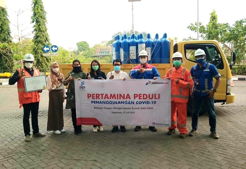 YOGYAKARTA - Subholding Gas Grup sebagai bagian dari Holding Migas PT Pertamina (Persero) bersinergi dalam menyerahkan bantuan oksigen sebanyak 50 tabung berukuran 6 M³ ke Rumah Sakit UGM Yogyakarta, (22/07/2021). Melalui program Pertamina Peduli, bantuan oksigen diserahkan dalam rangka memenuhi tingginya kebutuhan oksigen medis di tengah lonjakan kasus COVID-19 di Yogyakarta.