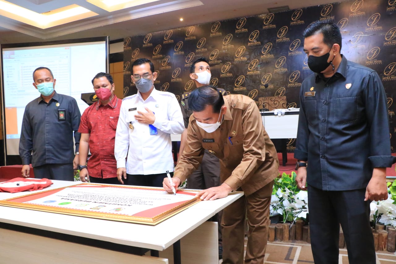 PEKANBARU - BNNK Pekanbaru dan Pemerintah Kota Pekanbaru menandatangani komitmen bersama dalam membentuk Kota Tanggap Ancaman Narkoba, Selasa (26/10/2021). Sejumlah instansi terkait juga ikut menandatangi komitmen bersama dalam kegiatan di Grand Jatra Pekanbaru.