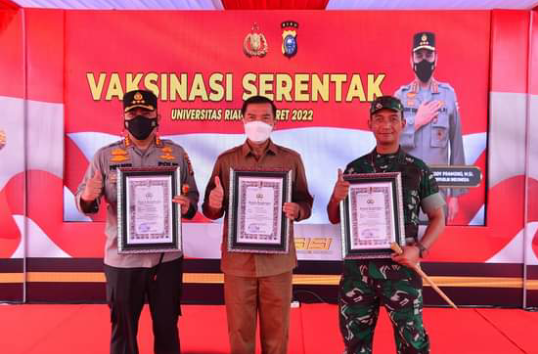 PEKANBARU - Wakil Kepala Kepolisian Republik Indonesia (Wakapolri) Komjen Pol Gatot Eddy, memberikan penghargaan kepada Walikota Pekanbaru Dr H Firdaus ST MT, atas capaian vaksinasi tertinggi di Riau. Penghargaan tersebut diserahkan Wakapolri ke Walikota Pekanbaru pada kegiatan vaksinasi massal yang dipusatkan di halaman Kampus Pascasarjana Universitas Riau (UR) di Jalan Gajah Mada, Pekanbaru, Kamis (24/3/2022) lalu.