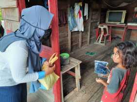 Adaptasi New Normal, KKN Relawan Unri Bagikan Makser di Tanjung Samak