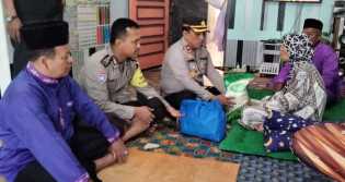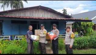 BENGKALIS - Personel Polsek Bukit Batu memberikan bantuan sembako kepada masyarakat yang membutuhkan, Jumat (1.
