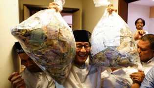 JAKARTA - Calon wakil presiden nomor urut 02 Sandiaga Uno mengangkut dua karung plastik berisi uang usai berkampanye di Medan, .