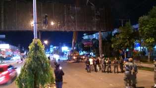 PEKANBARU - Pemotongan bando atau papan reklame yang mengangkangi jalan masih berlanjut. Target Satp.